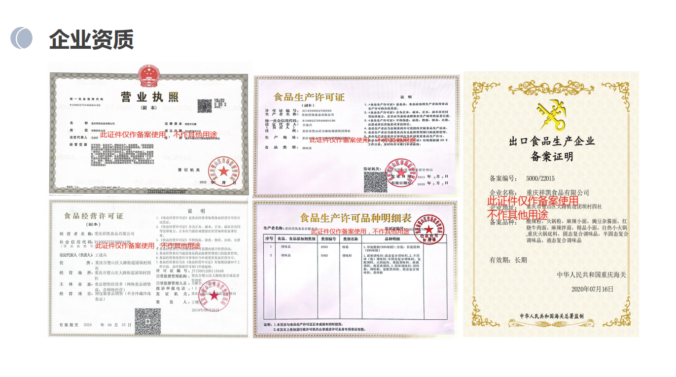 公司先后通過ISO三體系認(rèn)證,知識(shí)產(chǎn)權(quán)認(rèn)證,兩化融合A級(jí)認(rèn)證,有系統(tǒng)的多層次員工培訓(xùn)體系。2019年成為“示范食品生產(chǎn)企業(yè)”,2020-2023年被授予“區(qū)級(jí)農(nóng)業(yè)產(chǎn)業(yè)化龍頭企業(yè)”,2022年獲得高新技術(shù)企業(yè)(證書編號(hào)GR202251101662),是重慶江湖菜發(fā)展促進(jìn)會(huì)理事單位,重慶火鍋產(chǎn)業(yè)集團(tuán)副會(huì)長(zhǎng)單位,也是重慶輕工職業(yè)學(xué)院共建單位,重慶食品工業(yè)研究所合作單位。